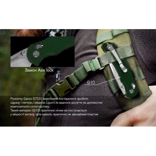Лезо Ganzo 7531 утримується за рахунок замку Axis у відкритому або складеному положенні. Цей фіксатор на базі металевого штифта істотно підвищує рівень безпеки користувача під час роботи з ножем.