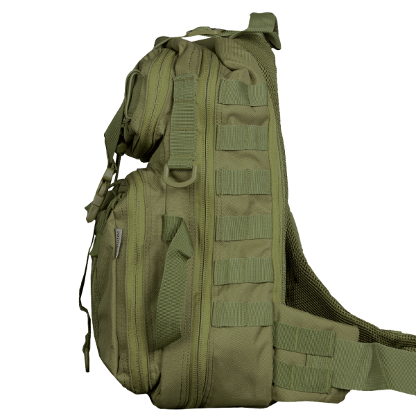 Зазвичай цей рюкзак носять через плече, для цього на ньому присутня широка, м’яка лямка зі спіненого матеріалу. Лямка зручно лягає за формою тіла та не заважає при пересувані. Додатково на основній лямці присутня фіксуюча лямка, яка чіпляється збоку, це не дозволяє основній лямці гойдатись при активних діях, а також надійно фіксує рюкзак в одному положені. Для швидкого зняття рюкзака достатньо лише розстібнути пластикову застібку, за допомогою якої фіксуються обидва кінці лямки. Також зверху та збоку присутні міцні ручки для швидкого доступу до рюкзака або просто для перенесення його в руках.