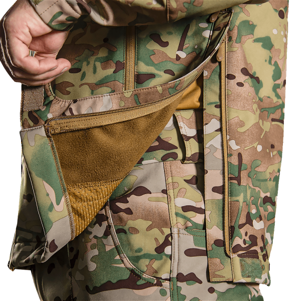 Тактичний костюм з мембранної тканини SoftShell. Це легка, сучасна тканина зі справжньою безпоровою мембраною, яка складається з трьох шарів: мікрофліс який зберігає тепло; мембрана що захищає від вітру та вологи; еластичний поліестер із вологостійким просоченням, який захищає від пилу, бруду й вологи.