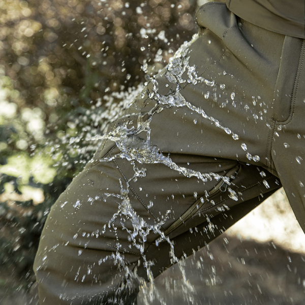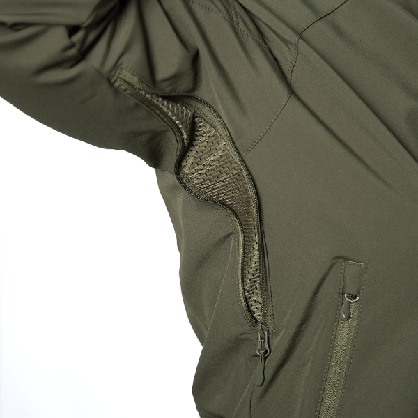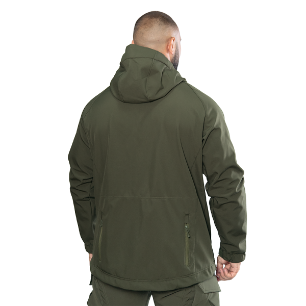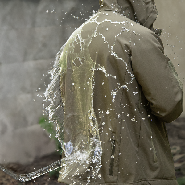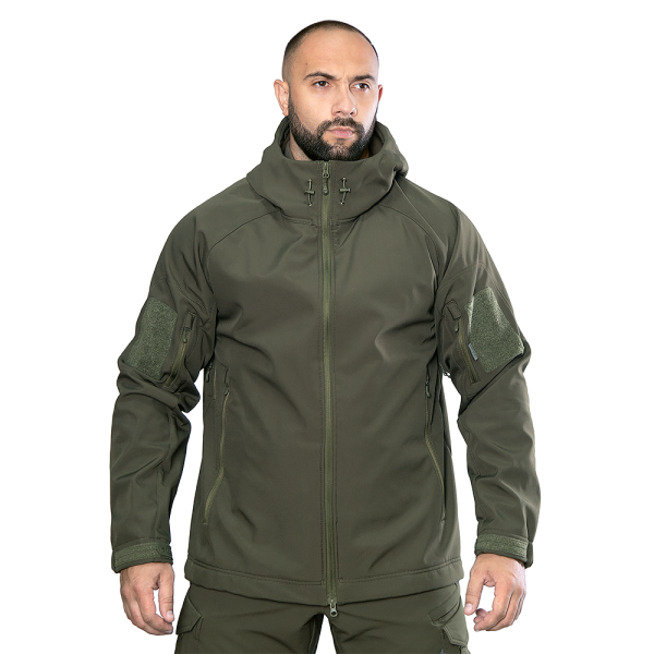 Тактичний костюм з мембранної тканини SoftShell. Це легка, сучасна тканина зі справжньою безпоровою мембраною, яка складається з трьох шарів: мікрофліс який зберігає тепло; мембрана що захищає від вітру та вологи; еластичний поліестер із вологостійким просоченням, який захищає від пилу, бруду й вологи.