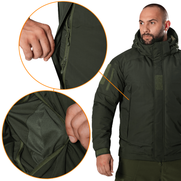 Манжети регулюються липучками, а низ куртки оснащений утяжками з пластиковими фіксаторами для додаткової герметичності. Центральна блискавка прикрита планкою на липучках, яка захищає від продування та проникнення вологи.