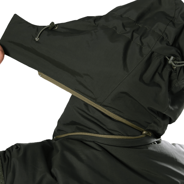 Манжети регулюються липучками, а низ куртки оснащений утяжками з пластиковими фіксаторами для додаткової герметичності. Центральна блискавка прикрита планкою на липучках, яка захищає від продування та проникнення вологи.