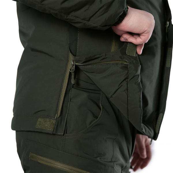 Спереду куртка має кишені з флісовим підкладом — в холодну погоду ви можете швидко зігріти руки. Окрім цих кишень, є ще по кишені на рукавах, дві кишені на грудях з захисним клапаном, а також три внутрішні кишені. Також всі застібки мають захисні клапани, які захищають бігунок застібки від вологи та бруду.