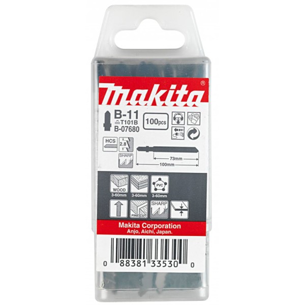 Набор из 100 очень твердых пильных полотен Makita B-11, изготовленных из высокоуглеродистой HCS стали, рабочей длиной 73 мм, с шагом зубьев 2,8 мм предназначены совершать ровные пропилы в древесине. Длина полотна дает возможность разрезать древесину хвойных, твердых пород, а также пластмассы толщиной 3-60 мм.