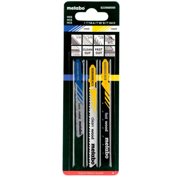 Набір з 3 пиляльних полотен Metabo по деревині, металу. Складається з пилок 623634000, 623633000, 623637000. Виготовлені з високовуглецевої та швидкорізальної сталі. Підходять до лобзиків будь-яких виробників.