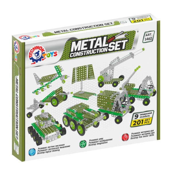 "Военная техника ТехноК" (201 деталь) - металлический конструктор с тематической военной комплектацией. Преимущество игрушки - металлические детали разных цветов и интересные разноцветные пластиковые детали.