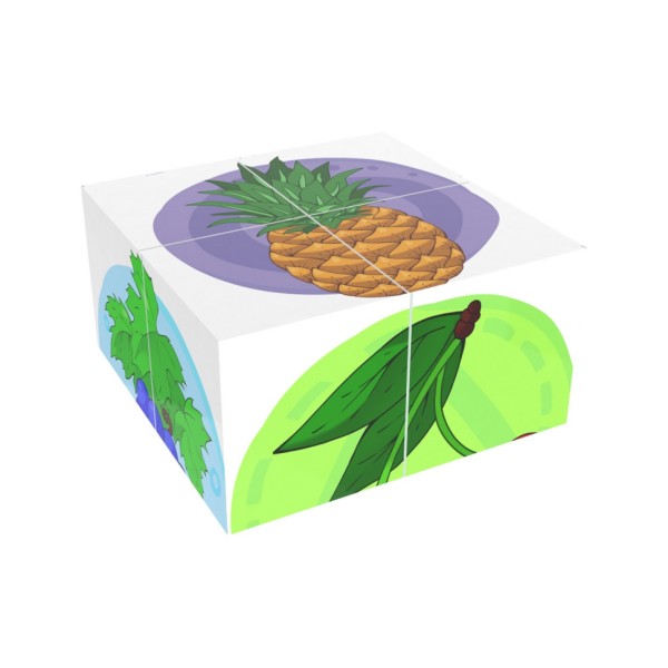 Кубики-пазли "Фрукти" -цікава і водночас корисна розвиваюча іграшка. У наборі 4 кубики з зображеннями різних фруктів. На кожній стороні кубика - частина яскравого малюнка. І тільки правильно склавши 4 кубика - отримаємо цілий малюнок. Збираючи кубики-пазли, діти розвивають дрібну моторику, уважність, логічне мислення і пам'ять. Такі ігри допомагають вивчити кольори і назви фруктів. Граючи разом з дорослими, діти добре розвивають мовлення, оскільки часто повторюють нові слова під час гри. З кубиків можна зібрати 6 малюнків: виноград, яблуко, вишня, ананас, банани, полуниця. Іграшка виготовлена з міцного та безпечного пластику, без запаху. Розмір кожного кубика: 4х4х4 см. Розмір упаковки: 8х8х4 см.