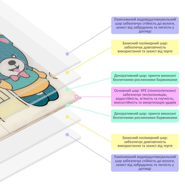Дитячі розвиваючі термокилимки виготовляються з мультифункціонального, нетоксичного та гіпоалергенного матеріалу XPE (спінений та пресований полімер етилену) та об’єднує в собі багато переваг: теплоізоляція, вологостійкість, зносостійкість, легкість в догляді, м’якість, гнучкість та амортизація падіння малюка, надаючи дітям комфортну та безпечну ігрову поверхню.