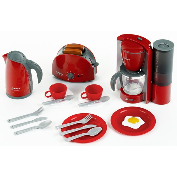 "Набір для сніданку Bosch - Іграшка з допустимими для використання дітьми функціями - Дизайн Bosch Набір, що складається з: - Тостер із механічною функцією - Кавоварка з можливістю заповнення водою та подачею води - Чайник, може бути заповнений водою - Смажене яйце, 2 тарілки, 2 вилки, 2 ножі, 2 ложки, 2 блюдця, 2 чашки, 2 кухонні ложки - Рекомендується дітям віком від 3 років"