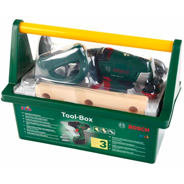 "Ящик з інструментами Bosch - Міцний ящик із зручною ручкою для перенесення - Скринька з інструментами та обладнання в оригінальному дизайні Bosch Включає викрутку II Bosch - З живленням від акумулятора, правостороннє/лівостороннє обертання - Світловий та звуковий ефект - Змінні біти З широким асортиментом аксесуарів: Молоток, пила, розвідний гайковий ключ, цвяхи, планки, шурупи та гайки - Рекомендується дітям віком від 3 років"