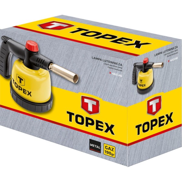 Лампа лютувальна TOPEX (арт. 44E140) виготовляється з металу. До ламп використовуються патроні з пропан-бутаном 190 г. Температура розігріву складає 1350 C. Продукт обладнаний регулятором сили полум я. Видаток газу 180 г/год., потужність устаткування складає 1,9 кВт. Уможливлює лютування з використанням цини, алюмінію, срібла, надання форми та згинання труб, пластин тощо. Додатково існує можливість використовувати лампу для усування лаку, розпалювання гриля, розігрівання гвинтів і розморожування труб. Марка TOPEX адресована майстрам.