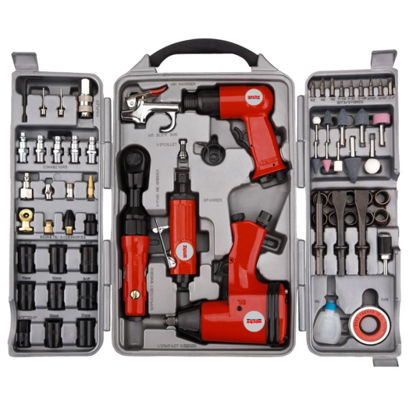 Інструменти, які входять до набору, включають ударний гайковерт, продувний пістолет, відбійний молоток і шліфувальну машинку, що надають максимальну гнучкість для виконання ремонтних, технічних та монтажних робіт. Завдяки швидкоз’єднувачам типу EURO та універсальним аксесуарам цей набір сумісний із більшістю пневматичних систем.