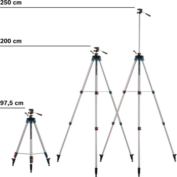 - Щоб надійно зафіксувати лазерні вимірювальні прилади використовують будівельний штатив Bosch BT 250 Professional.