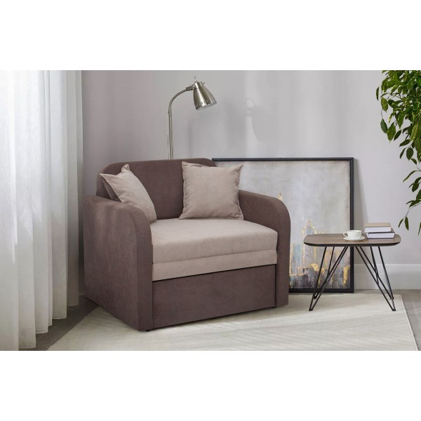Характеристики:Ширина: 970 мм; Глибина: 800 мм. Висота спинки: 800 мм; Висота підлокітників: 650 мм; Товщина підлокітників: 85 мм; Висота посадки: 450 мм; Ширина спального місця: 800 мм; Довжина спального місця: 1950 мм Каркас: ДСП + ДВП + Дерево. Наповнення: Поролон 25-ї щільності товщиною 100 мм на ламелях. В комплект входить дві подушки розміром 40*40мм. Також є ніша для білизни. Матеріал оббивки в складській програмі (поєднання тканин) Аляска 03/Аляска 23 ( Exim Textil)