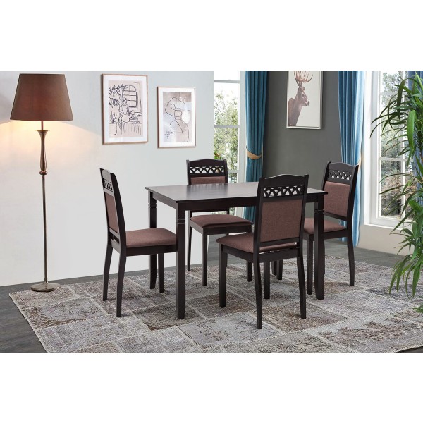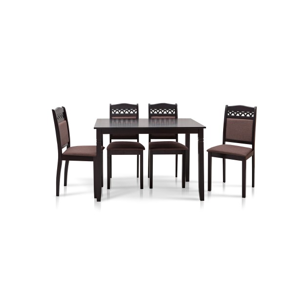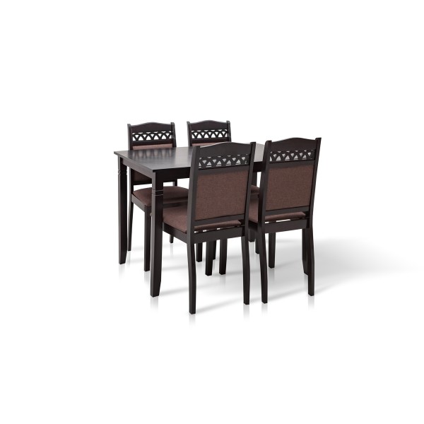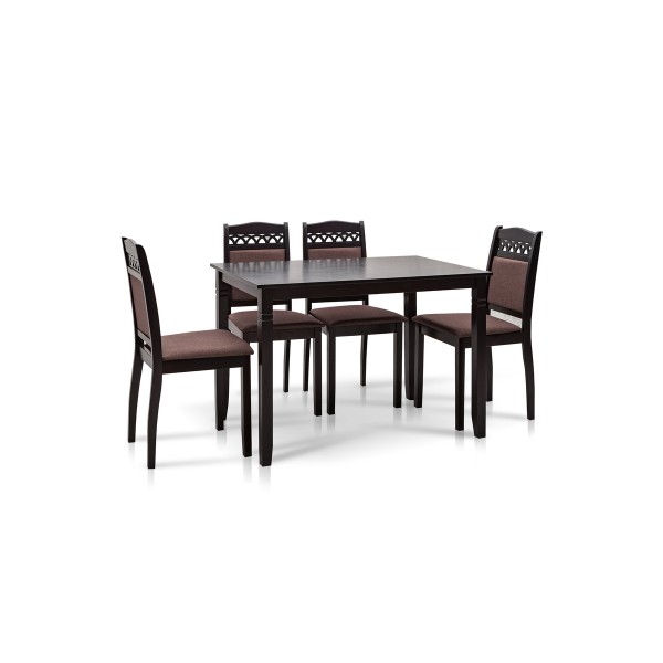 Розмір: Стіл: 1100*700 мм; Висота: 740мм. Стілець: 410*440; Висота: 910 мм. Колір: Венге шоколад ( DARK CAPUCINO); Тканина на стільцях: Темно-коричневий. Матеріал: Каркас і ніжки: Дерево, Гевея; Столешня: МДФ. Товщина столешні столу: 16 мм. Товщина ніжок столу: 45 мм. В Комплект входить 1 нерозкладний стіл та 4 стільця. Продаж лише комплектами.