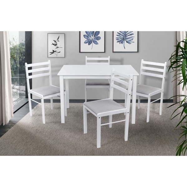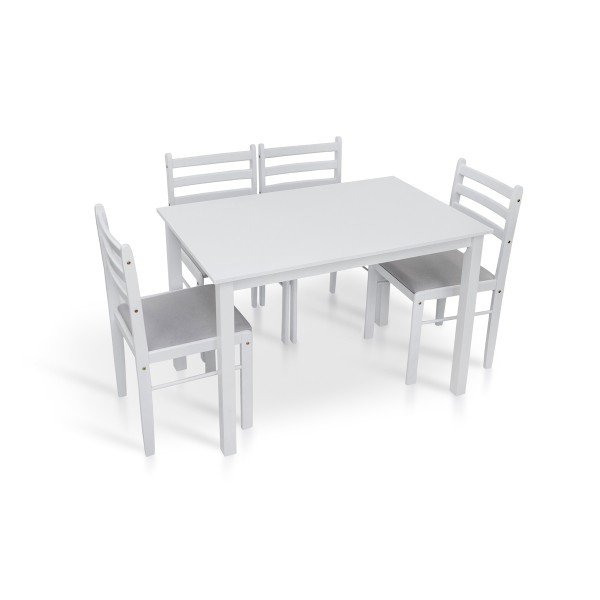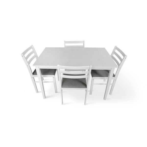 Комплект обідній Джерсі - це готове рішення для оформлення вашої обідньої зони. 4 стільці і стіл складуть головний акцент приміщення, завдяки натуральним матеріалам, внесуть гармонію і домашній затишок. Доступні кольори: білий, сірий та темний горіх. Даний комплект підійде для будинку або готельної їдальні. Прямокутні форми створені для сучасних і класичних інтер'єрів. Стіл з масиву дерева (гевея), ніжки товщиною 45х45 мм, стільниця з міцного і практичного МДФ покритого натуральним шпоном/або фарбована. Стілець також з масиву дерева, сидіння м'яке, оббивка з тканини, яка швидко і просто чиститься в разі потреби.