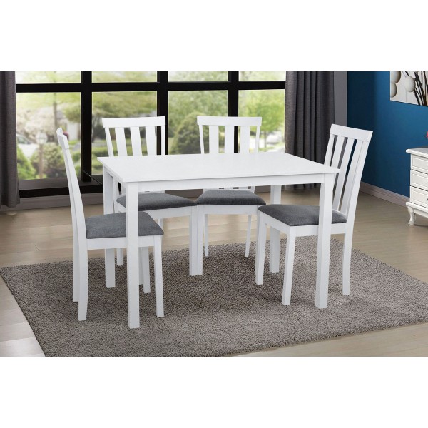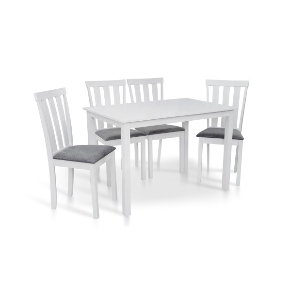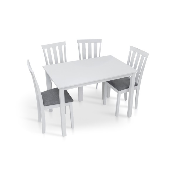Комплект обідній Юджин - це готове рішення для оформлення вашої обідньої зони. 4 стільці і стіл складуть головний акцент приміщення, завдяки натуральним матеріалам, внесуть гармонію і домашній затишок. Доступні кольори: білий та темний горіх. Даний комплект підійде для будинку або готельної їдальні. Форми комплекту створені для сучасних і класичних інтер'єрів. Стіл з масиву дерева (гевея), ніжки товщиною 45х45 мм, стільниця з міцного і практичного МДФ покритого натуральним шпоном/або фарбована. Стілець також з масиву дерева, сидіння м'яке, оббивка з тканини, яка швидко і просто чиститься в разі потреби.