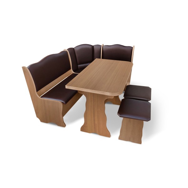 Розмір: Куток: 1400*1100, h-830, глубина 470; Стіл: 900*570/900*1140, h-726; Табурет: 350*350, h-420. Колір: ДСП Горіх еко/ шкірзамінник шоколад Матеріал: ДСП/шкірзамінник