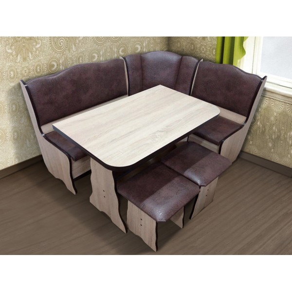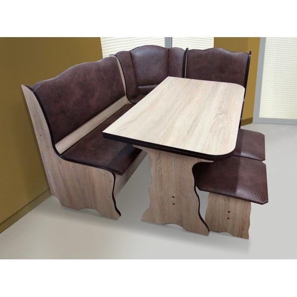 Розмір: Куток: 1400*1100, h-830, глубина 470; Стіл: 900*570/900*1140, h-726; Табурет: 350*350, h-420. Колір: ДСП Сонома/ шкірзамінник шоколад Матеріал: ДСП/шкірзамінник