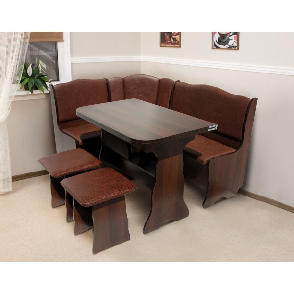 Розмір: Куток: 1400*1100, h-830, глибина 470; Стіл: 900*570/900*1140, h-726; Табурет: 350*350, h-420. Колір:ДСП темний горіх/шкірзамінник шоколад Матеріал: ДСП/шкірзамінник