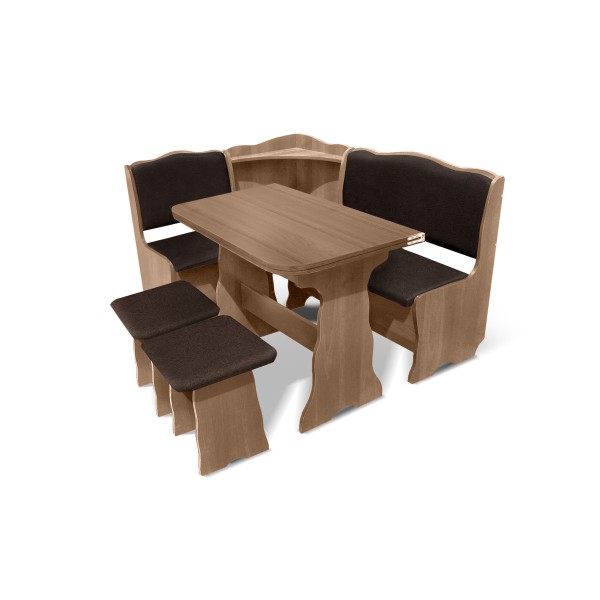 Розмір: Куток: 1400*1100, h-830, глибина 470; Стіл: 900*570/900*1140, h-726; Табурет: 350*350, h-420. Колір: Варіанти: 1. ДСП горіх /шкірзамінник шоколад.