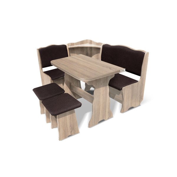 Розмір: Куток: 1400*1100, h-830, глибина 470; Стіл: 900*570/900*1140, h-726; Табурет: 350*350, h-420. Колір: Варіанти: 1. ДСП Сонома /шкірзамінник шоколад.