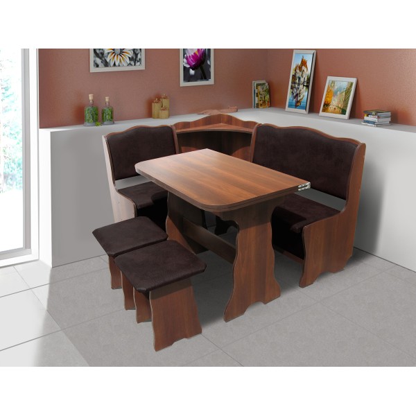 Розмір: Куток: 1400*1100, h-830, глибина 470; Стіл: 900*570/900*1140, h-726; Табурет: 350*350, h-420. Колір: Варіанти: 1. ДСП темний /шкірзамінник шоколад.
