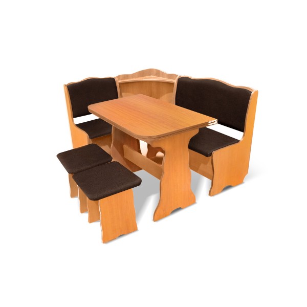Розмір: Куток: 1400*1100, h-830, глибина 470; Стіл: 900*570/900*1140, h-726; Табурет: 350*350, h-420. Колір: Варіанти: 1. ДСП вишня/шкірзамінник шоколад.