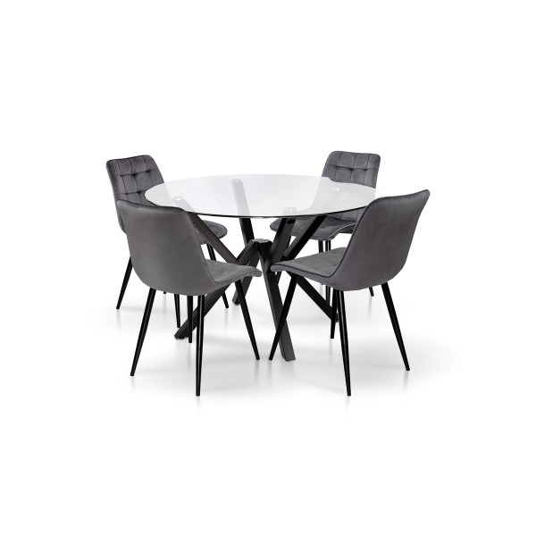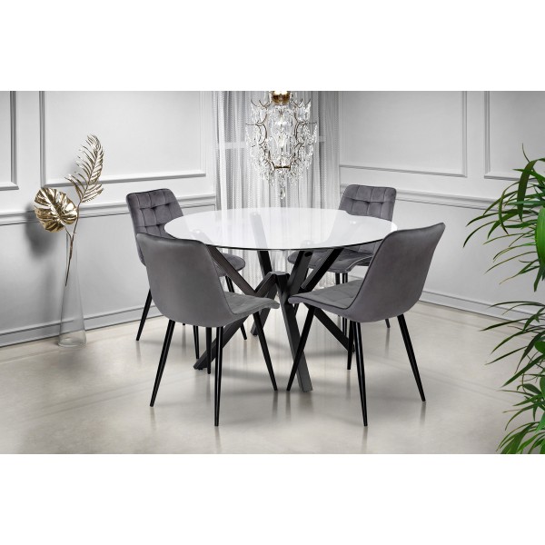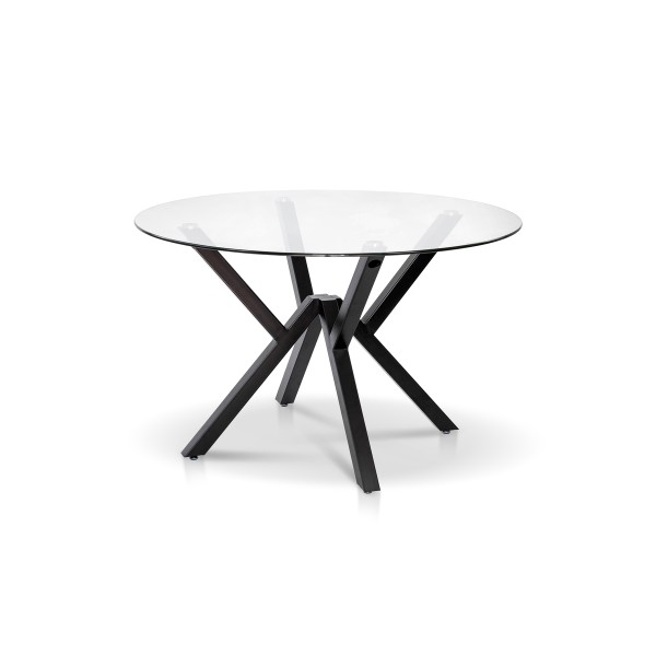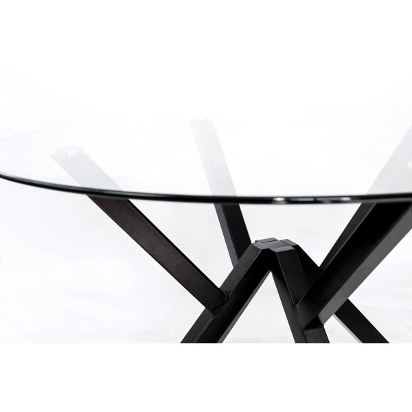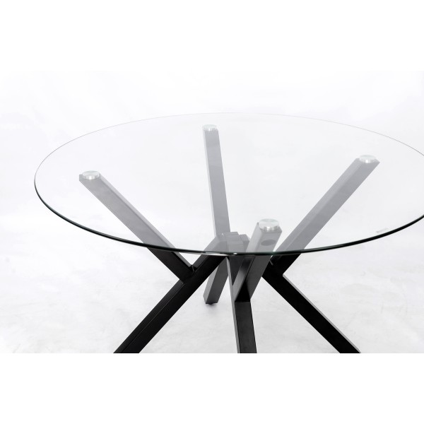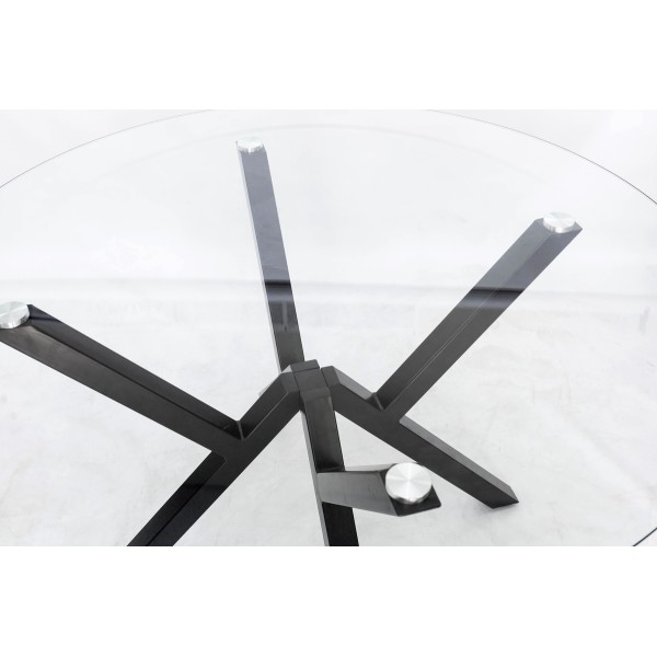 Основа столешні: Скло прозоре, термозагартоване (триплікс). Товщина скла = 10 мм.Ніжки - метал, чорний колір порошкова покраска. Розмір стільниці D=120 см. Висота: 75 см. Загартоване скло прозоре. Ніжки чорні металеві