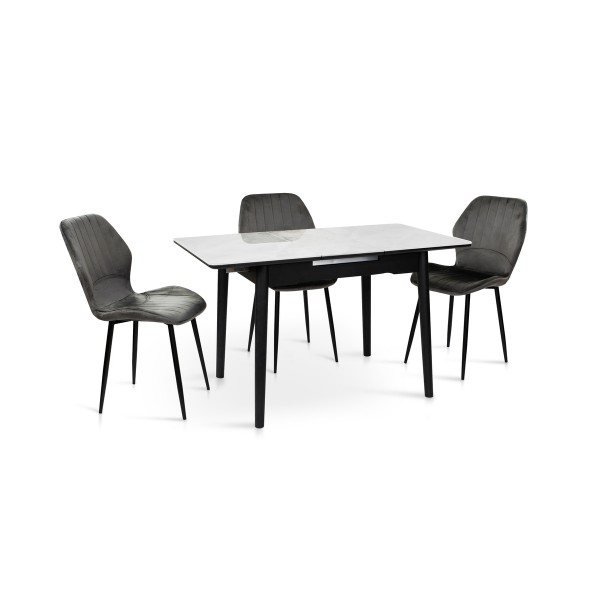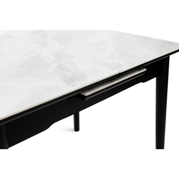 Колір: Ніжки: Чорний; Столешня: Кераміка бетон сіро-бежевий Матеріал: Ніжки і каркас: Дерево; Столешня: МДФ товщиною 22 мм + керамічна накладка товщиною 6 мм. Стільниця столу виготовлена з МДФ+керамічне покриття, стійка до перепаду температур, ударів і царапин.
