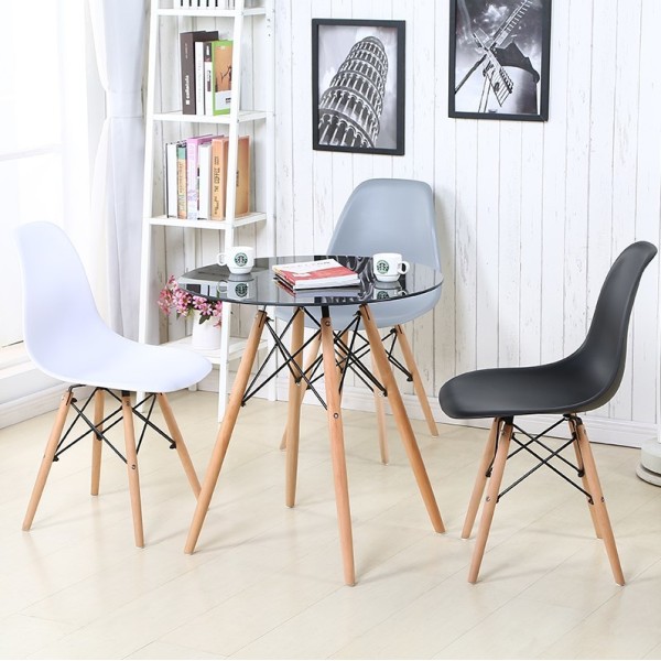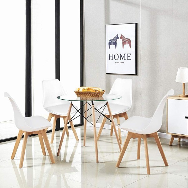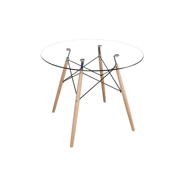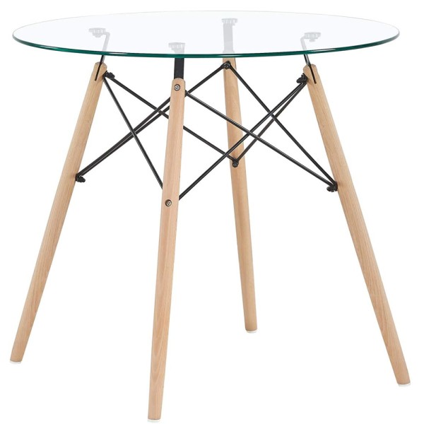 Стільниця: Скло прозоре, загартоване. Кріплення ніжок - металл товщина скла = 10 мм. Ніжки - деревина, бук. Висота: 75 см. Діаметр: 80 см.