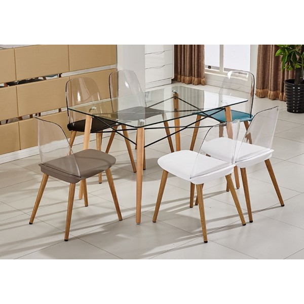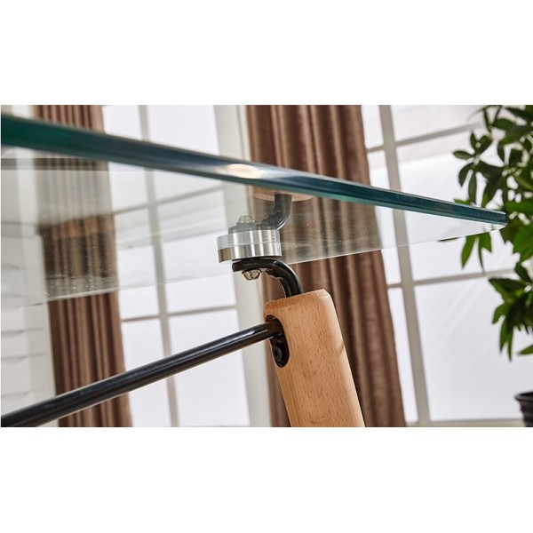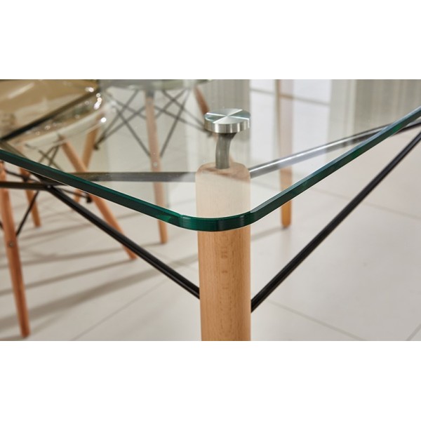 Стільниця: Скло прозоре, загартоване. Кріплення ніжок - металл товщина скла = 10 мм. Ніжки - деревина, бук. Висота: 75 см. Розмір стільниці: 120*80 см. Загартоване скло прозоре