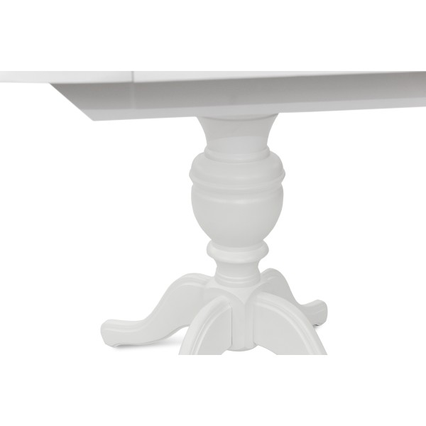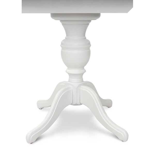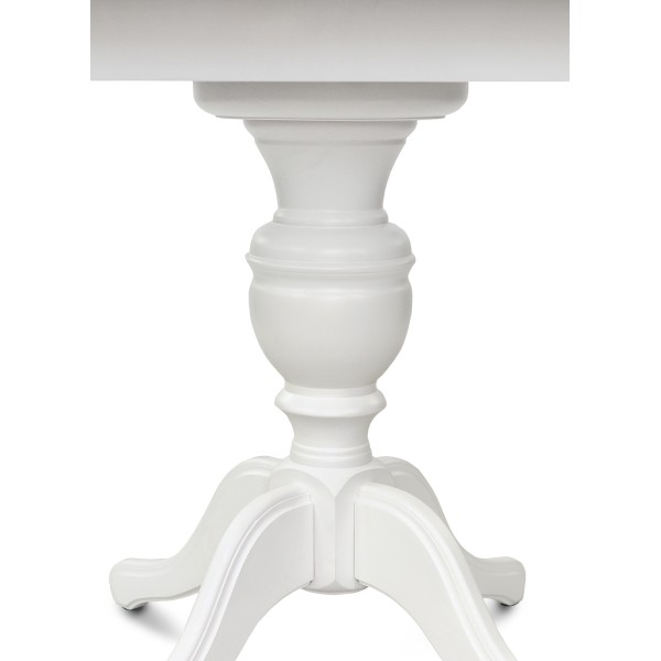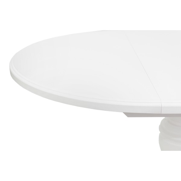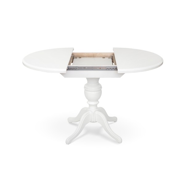 Розмір: D=89см, (+38см вкладка) Колір: Білий Матеріал: Каркас: масив сосни; Столешня: МДФ фарбований; Гермес – розсувний овальний стіл для вітальні з елегантною точеною ніжкою, виготовлений з натурального дерева. Торці столу гарно фрезеровані та пофарбовані. Столик виготовлений із масиву натурального дерева (каркас та ніжки). Натуральна деревина - це матеріал, який фактично позбавлений недоліків, тому що вона щільна, тверда, красива. Стільниця виготовлена з плити МДФ, покритої шпоном.