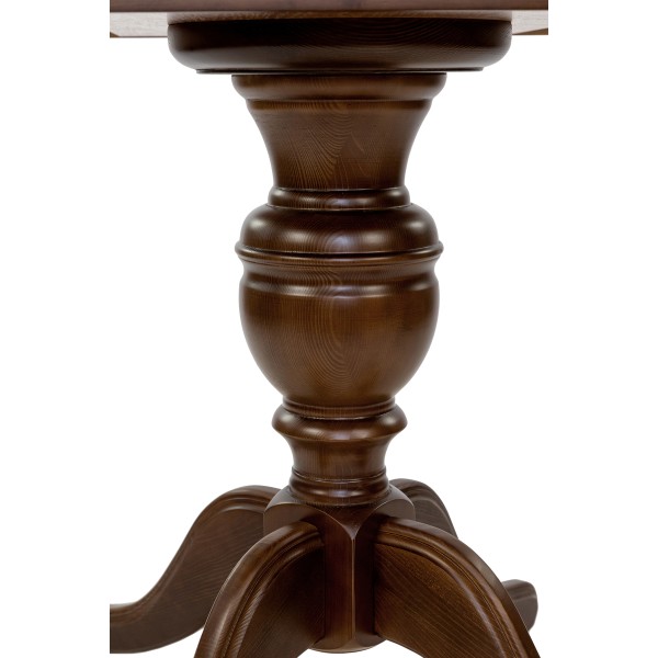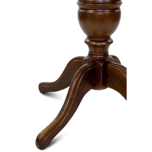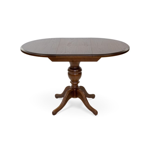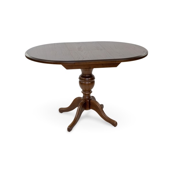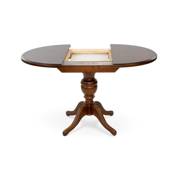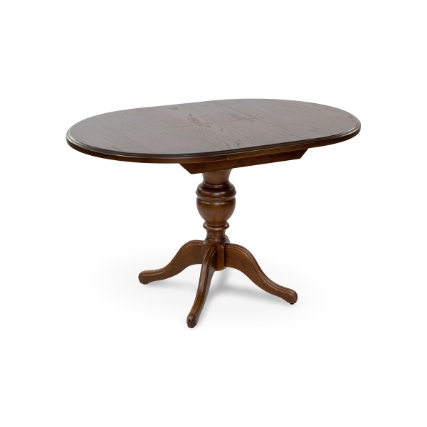 Розмір: D=89см, (+38см вкладка) Колір: Горіх Матеріал: Каркас: масив сосни; Столешня: МДФ фарбований; Гермес – розсувний овальний стіл для вітальні з елегантною точеною ніжкою, виготовлений з натурального дерева. Торці столу гарно фрезеровані та пофарбовані. Столик виготовлений із масиву натурального дерева (каркас та ніжки). Натуральна деревина - це матеріал, який фактично позбавлений недоліків, тому що вона щільна, тверда, красива. Стільниця виготовлена з плити МДФ, покритої шпоном.