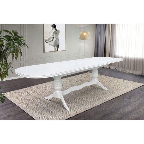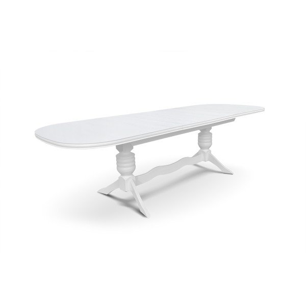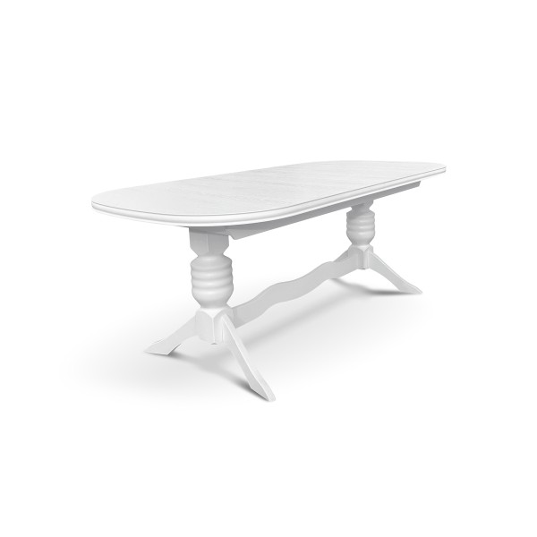 Стіл обідній Гетьман виготовлений з комбінації матеріалів, різьблені ніжки і подстолье - масив бука, стільниця МДФ, натуральний шпон. При розкладці столу можна використовувати дві центральні вставки, таким чином стільниця розміром 2000 мм збільшитися +400 і + 400. За столом зручно зможе розміститися 10 осіб. Розміри,мм :2000(+400+400)*1000 Колір: білий, темний горіх