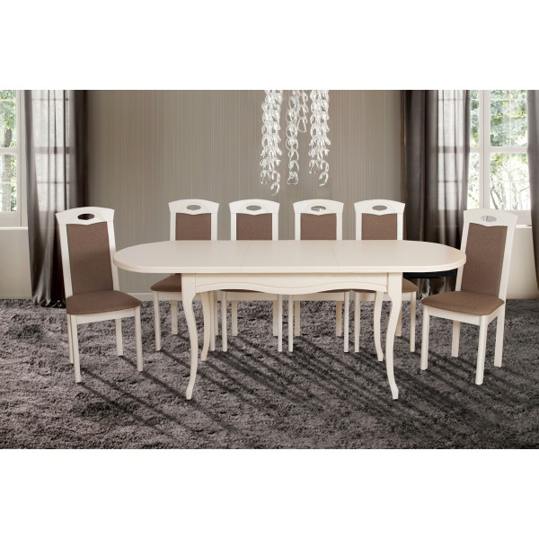 Розмір: 1500(+500)*845 Колір: білий, бежевий Матеріал: Каркас: масив клена; столешня: МДФ зі штучним шпономРозкладний стіл «Олівер» — зробить Вашу вітальню, місцем приємних обідів і вечері, веселих посиденьок з друзями, цей стіл ідеально впишеться і внесе в інтер'єр Вашого будинку, той необхідний затишок Кухонний стіл «Олівер» виконаний в класичному стилі з застосуванням натурального дерева — каркас і ноги з масиву Клена, стільниця з МДФ покрита штучним шпоном, така стільниця володіє наявністю стійкості до механічних пошкоджень і води. Вставка 50 см.