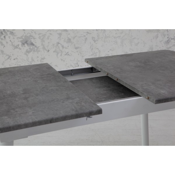 Розмір: 1100(+350)*700. Колір: Каркас і ніжки: Білий; Столешня: мрпмор світл. Матеріал: Каркас і ніжки: Метал; Столешня: МДФ у ПВХ плівці. Вкладка в стіл суцільна, зберігається у столі. Товщина столешні: 20 мм. Каркас і ніжки: порошкова покраска.