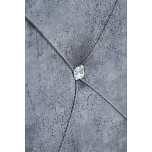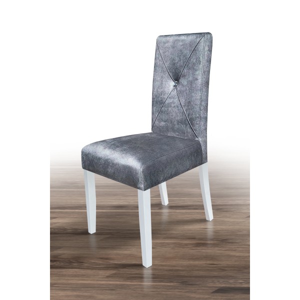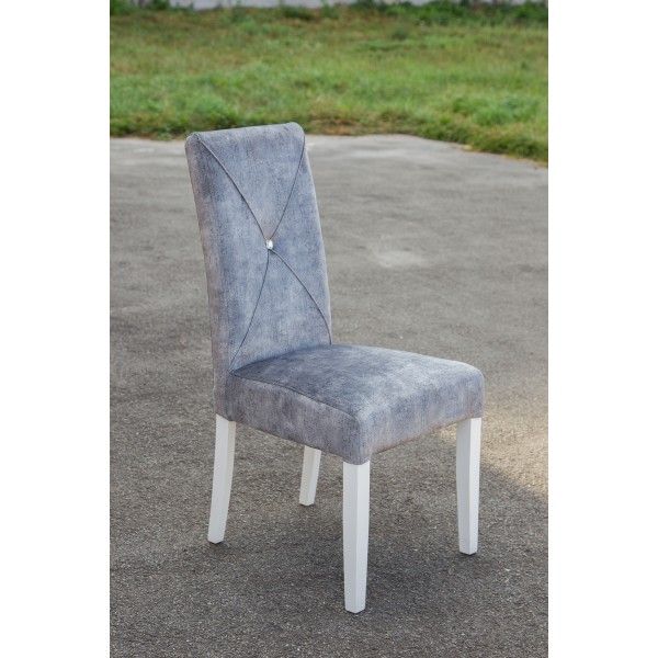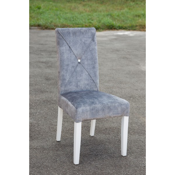 Дерев'яний обідній стілець з масиву бука з м'якими сидінням і спинкою, оббитими тканиною сірого кольору, спинка декорована затяжками та "кристалом" Габарити: 470х410х1100мм Колір фарбування дерева: білий, слонова кістка
