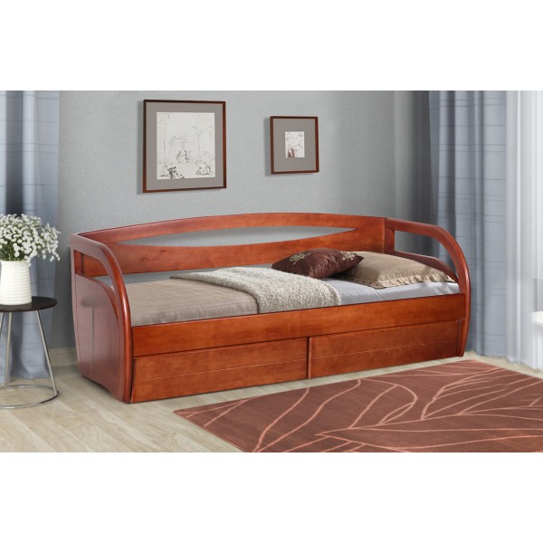 Розмір: 800*2000; 900*2000; габаритні розміри: до ширини спального місця + 8 см, до довжини + 8 см;¶¶висота спинки - 82 см; висота підлокітників - 75 см; відстань від полу до низу царги - 25,5 см; ¶¶відстань від полу до верху царги - 38,5 см; глибина посадки матраца - 4 см; відстань між ламелями - 5,5 см.¶¶Колір: Білий, Слонова кістка, Горіх, Темний горіх, Яблуня, Каштан.¶¶Додаткова комплектація: Бокова планка.¶¶Розмір: 1100 мм*300 мм.¶¶Матеріал: Масив вільхи.¶¶Дерев'яне ліжко «Баварія» з ящиками має оригінальний дизайн і виконане у виді софи. При виготовленні даного ліжка використовуються матеріали і комплектуючі тільки найвищої якості, що яляється гарантією його надійності і довговічності.
