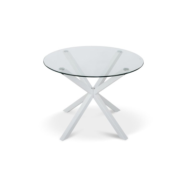 Розмір: D=1000; Висота: 750. Колір: Ніжки: білий; Столешня: Прозоре скло. Матеріал: Ніжки: Метал; Столешня: Загартоване скло. Товщина столешні: 10 мм. Загартоване скло - звичайне листове скло, яке спочатку нагрівають до температури загартування (650—680 °C), а потім рівномірно охолоджують холодним повітрям з обох боків. В результаті такої обробки в поверхневих шарах скла утворюються залишкові механічні напруги стиснення, що забезпечують його підвищену механічну міцність, термостійкість і безпеку при руйнуванні.