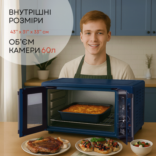 ТЕРМОРУКАВИЦА В ПОДАРОК! Объём: 60 л; Высота внутренней камеры: 35 см; Мощность: 1900 Вт; Термостат: 250 град.; Комплектация: решетка, противень, вертел, держатель для противня, лоток для жира, терморукавица; Стекло в дверце: 1; Режимы приготовления: 6; Конвекция; Подсветка; Управление: механическое; Особенности: синхронное открывание дверей; Внутреннее покрытие: цинковое; Размер изделия: 58х40,7х44,7 см; Цвет: темно-синий.