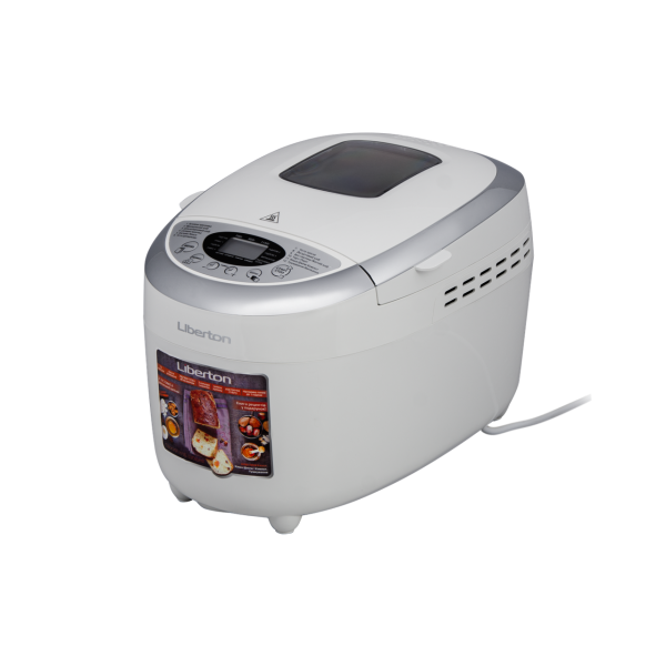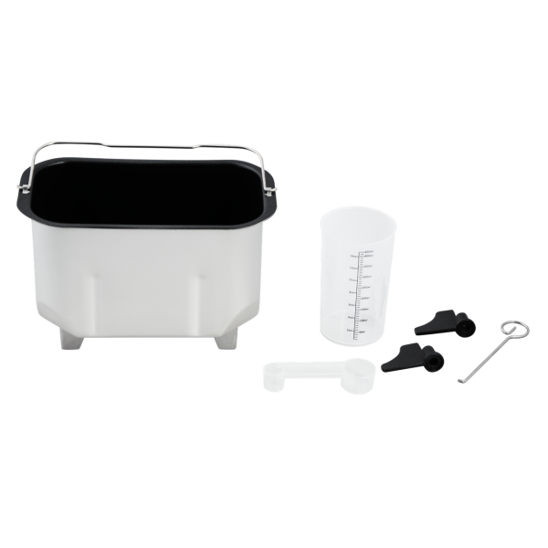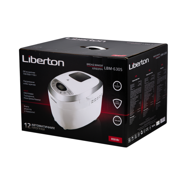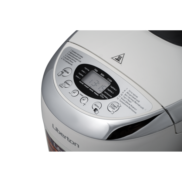 Потужність: 850 Вт; Об'єм випічки: 700/900/1150 г; Кількість програм: 12; Форма випічки: прямокутна; Додаткові функції: підтримка температури, відстрочка старту, 3 рівня запікання скоринки, звуковий сигнал; Комплектація: форма з антипригарним покриттям, мірний стакан, мірна ложка, 2 тістоміса, гачок; Матеріал корпусу: пластик; Розмір виробу: 42,2х27,6х27 см; Колір: білий+металік.