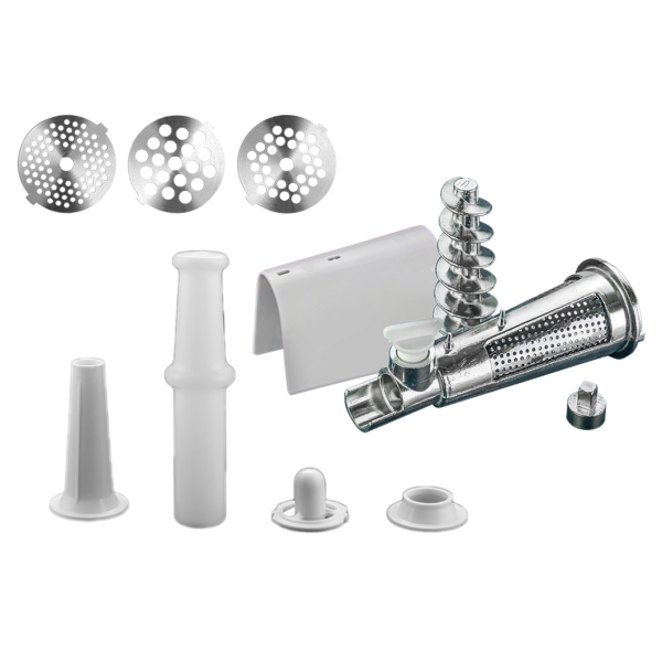 Потужність: 2000 Вт (при заклинюванні); Продуктивність: 1,4 кг/хв.; Функції: реверс, захист від перегріву; Аксесуари: 3 диска для помолу (3 мм/5 мм/7 мм), овочетерка (3 шт.), овочерізка (1 шт.), насадка для ковбас, насадка для кебе, соковитискач для томатів, штовхач, металевий лоток; Матеріал шнека: нержавіюча сталь; Матеріал корпусу: нержавіюча сталь; Розмір виробу: 27,9х25,8х15,5 см; Колір: нерж+чорний.