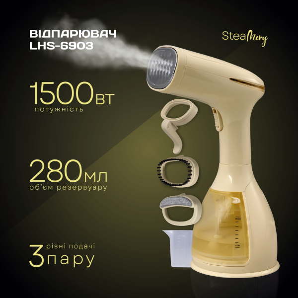 Потужність, Вт: 1500; Об'єм резервуару, мл: 280; Рівні подачі пари, шт.: 3; Потік пари, г/хв: 10/20/25; Матеріал платформи: нержавіюча сталь; Горизонтальне/вертикальне відпарювання: так; Опції: антикрапля, посилена подача пари, автопара, автовідключення; Комплектація: стандартна щітка, щітка для ворсу, мірна склянка; Розмір виробу, см: 16х11,3х27,6; Колір: світло-жовтий.