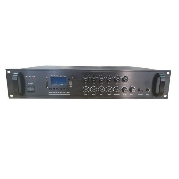 Цей підсилювач звуку CMB-240 забезпечує професійну якість трансляції для великих приміщень. Потужність пристрою становить 240 Вт середньої та 300 Вт максимальної, що дозволяє озвучувати до шести зон. Його компактний розмір 480х380х98 мм полегшує встановлення. Мікшер оснащений кількома входами, включаючи MIC, LINE, CD/Tuner/Tape/Aux, а також USB та SD для відтворення MP3/WMA. Вбудований FM-приймач розширює можливості пристрою, а регулювання частот дозволяє налаштувати ідеальне звучання. Цей підсилювач звуку підтримує різні варіанти підключення, включаючи виходи на 4/8/16 Ом та на 25/70/100 В. Коефіцієнт гармонійних спотворень становить менше 0.5%, що забезпечує чистоту звуку. Надійність і функціональність роблять його незамінним. Рекомендуємо купити підсилювач звуку CMB-240 для створення ідеальної звукової атмосфери в будь-якому просторі. CMB-240 Мікшер / підсилювач. Це 6-ти зонний, трансляційний підсилювач100V з широким функціоналом і безліччю входів і виходів. Є вбудований програвач MP3 / WMA c USB / SD носія і вбудований FM приймач. Вихідна потужність (Середня): 240 W Вихідна потужність (Max.): 300 W Аудіо-вхід: 2 MIC LINE, 1 LINE (CD / Tuner / Tape / Aux) USB / SD-інтерфейс: MP3 / WMA formats MIC (Опір / Чутливість): 600 Ом / 2.7 mV LINE (Опір / Чутливість): 47k / 100 mV AUX (Опір / Чутливість): 20k / 100 mV CD (Опір / Чутливість): 47k / 570 mV Tuner (Опір / Чутливість): 56k / 300 mV Tape (Опір / Чутливість): 1 k / 1 V Прямі виходи: 4,8,16 Ом / 25,70,100 V Зональні виходи: 6 зони: 100V (ONLY) Pre-out: 600 Ом / 1V Частота: 60Hz-16KHz / ± 3DB EQ Contorl (бас): ± 10DB / 25Hz-160Hz / Центральна частота 60Hz EQ Contorl (ВЧ): ± 10DB / 4kHz-20kHz / Центральна частота 10kHz Співвідношення сигнал / шум: 80 dB (LINE), 60 dB (MIC) Сумарний коефіцієнт гармонійних спотворень Менше 0.5% Головне джерело живлення змінного струму: 110 / 230V 50 / 60hz Розміри: 480 * 380 * 98mm Вага: 9,6 кг