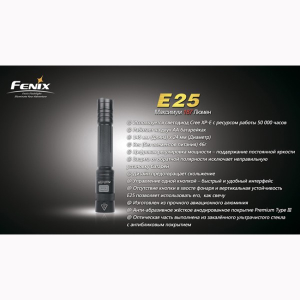 Компактний і легкий ліхтар E25 Cree XP-E від виробника Fenix, який є новинкою цього року. В моделі використовується світлодіод XP-E від американської компанії Cree з максимальною потужністю 187 люмен, здатний освітити простір на відстані 156 метрів. Ліхтар Fenix E25 Cree XP-E має три рівня яскравості, які перемикаються зручною кнопкою в головній частині: 187 лм (час безперервної роботи 2 години 20 хвилин), 90 лм (6 годин 15 хвилин) і 27 лм (26 годин). Роботу ліхтаря забезпечують два живлять елемента стандарту АА. Для запобігання втрати працездатності моделі виробник рекомендує користуватися якісними батареями та акумуляторами. Підтримання постійної яскравості, незалежно від рівня заряду батарей, забезпечують підвищує драйвер і спеціальний контролер. Конструкція ліхтаря забезпечує ступінь захисту від вологи IP-Х8. Ліхтар витримує 30-хвилинне занурення у воду на глибину до двох метрів.Гарантія: