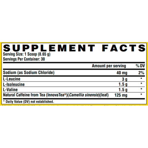 Розмір порції: 1 мірна ложка (8,65 г) Кількість порцій в упаковці: 30 Кількість на порцію %DV Натрій (у вигляді хлориду натрію) 40 мг 2% L-лейцин 3 г * L-ізолейцин 1,5 г * L- валін 1,5 г * Натуральний кофеїн із чаю (InnovaTea®) ( Camellia sinensis ) (листя) 125 мг * *Денну норму (DV) не встановлено. ІНШІ ІНГРЕДІЄНТИ: лимонна кислота, натуральні та штучні ароматизатори, діоксид кремнію, яблучна кислота, сукралоза, ацесульфам калію