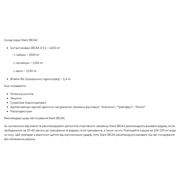 Stark IBCAA – це поєднання незамінних амінокислот L-форми, які значною мірою синергетично посилюють дії один одного. Як відомо, лейцин, ізолейцин і валін живлять 35% всіх м'язових тканин, що прискорює процес набору сухої м'язової маси. Крім яскраво вираженого анаболічного ефекту, Stark IBCAA є невід'ємною добавкою для підживлення м'язових клітин як паливо. Саме ВСАА живлять енергією міофібрили під час важких тренувань.