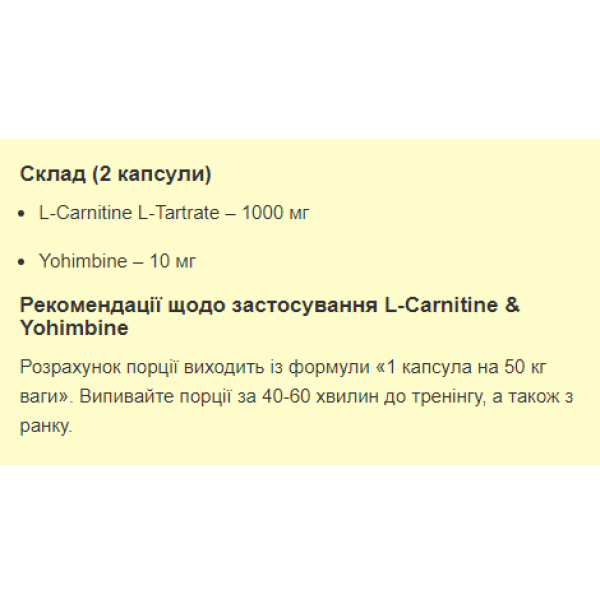 L-Carnitine & Yohimbine Stark Pharm – комплексна жироспалююча добавка натурального походження: Л-карнітин + йохімбін. Препарат має м'яку та поступову, але надефективну дію: за місяць можна знизити вагу на 2-7 кілограм. Результат безпосередньо залежить від регулярних та грамотних тренувань (будь-який вид фізичної активності: робота з залізом, біг, кросфіт, боротьба тощо) та збалансованого харчування зі зниженою добовою калорійністю. За допомогою поєднання карнітин + йохімбін від Старк Фарм стає набагато легше досягти красивої та підтягнутої спортивної фігури, а якщо додатково купити протеїн, за допомогою цільових тренувань можна покращити рельєфність та промальовування м'язів за рахунок зменшення підшкірно-жирового прошарку.