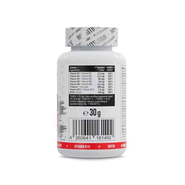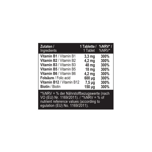 MST® B300 vitamin complex 100 таблеток є повним комплексом вітамінів групи В, що є складовою ензимів, що регулюють метаболізм вуглеводів, жирів і білків в організмі. Висока концентрація вітамінів у складі VITAMIN B 300 СOMPLEX дозволяє вживати по одній таблетці на день. B-комплекс від MST підтримує нормальну роботу нервової системи, тому він особливо ефективний при стресових ситуаціях та фізичній напрузі. Ці вітаміни однаково корисні для всіх, оскільки зменшують наслідки стресу. Завдяки своєму складу VITAMIN B 300 СOMPLEX благотворно впливає на роботу всього організму, який схильний до постійних стресів. Крім того, вітаміни групи B допомагають зберегти цілісність шкіри та слизової оболонки, а також беруть участь в обмінних процесах, надають сприятливий вплив на запальні та дегенеративні захворювання рухового апарату, сприяють посиленню кровотоку. Застосування вітамінів групи В як комплексу збільшує їх ефективність, оскільки ефективність комбінації перевищує ефективність окремих компонентів. Застосування цих вітамінів спрямоване на те, щоб з одного боку компенсувати існуючий дефіцит і, з іншого боку, щоб стимулювати природні механізми в організмі, спрямовані на відновлення. Наукові дослідження доводять непряму аналгетичну дію комплексу вітамінів групи В та їх високу безпеку. MST® B300 vitamin complex 100 таблеток ЗДІЙСНЮЄ: - нормалізації білкового, вуглеводного та жирового обміну, покращує функцію рухових, чутливих та вегетативних нервів, - підтримці роботи серцево-судинної системи, - зниження втоми та стомлюваності, - Захист організму від окисних процесів, - роботи печінки та травної системи, - Зміцнення гладкої мускулатури, - Насичення мозку киснем, - хорошій роботі надниркових залоз, - Вироблення гормонів, - утворенню червоних кров'яних тілець, - Поліпшенню зору, - Прискорення росту волосся. Тіамін (В1) перешкоджає гліколізуванню білка, має антиоксидантну активність, бере участь у регуляції проведення нервових імпульсів. За участю вітаміну B1 виробляється ацетилхолін, який впливає на процеси запам'ятовування, на тонус м'язів серця та органів травного тракту. Практично у всіх процесах енергообміну бере участь тіамін (ліпідний обмін, білковий обмін, засвоєння амінокислот). B1 бере участь у передачі генетичної інформації у процесі поділу клітин. Вітамін В2 (рибофлавін) без нього не обходиться утворення червоних кров'яних тілець і антитіл, він потрібен для засвоєння заліза і синтезу гемоглобіну. Крім цього, рибофлавін впливає на функцію зору, регулює роботу надниркових залоз. Вітамін B3 (ніацин) Інші назви - нікотинова кислота, вітамін PP. Понад 50 ферментативних реакцій проходять за участю вітаміну В3. Він нормалізує холестериновий та вуглеводний обміни, сприяє засвоєнню поживних речовин (жирів, білків, вуглеводів), виділенню енергії, синтезу ферментів. Без нього неможливе продукування деяких гормонів, у тому числі інсуліну, кортизолу та статевих. Завдяки ніацину знижується артеріальний тиск, покращується робота центральної нервової системи та стан шкіри. Вітамін B5 (пантенол) Пантотенова кислота — основний помічник у загоєнні ран, оскільки бере участь у синтезі антитіл та регенерації тканин. Також B5 необхідний нормального обміну речовин, отримання енергії, регуляції роботи нервової системи. Він допомагає знизити рівень стресу. Піридоксин (В6) бере участь у синтезі н
